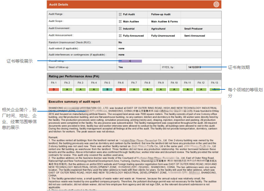 BSCI不發(fā)放任何形式的證書和認(rèn)證標(biāo)志,審核結(jié)束只有一份報(bào)告。BSCI報(bào)告的查詢地址是:http://www.bsciplatform.org,進(jìn)入后輸入用戶名(非DBID號(hào)碼)和密碼即可查詢目前狀態(tài)和報(bào)告。新標(biāo)準(zhǔn)中報(bào)告模版,評(píng)分標(biāo)準(zhǔn)發(fā)生了改變,仍然可以下載PDF版本的報(bào)告。"