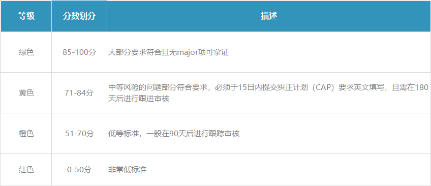 2、黃色(71-84分),中等風(fēng)險的問題部分符合要求,整改報告(CAP)必須于15個工作日內(nèi)提交,并且會在6個月后進行跟進。