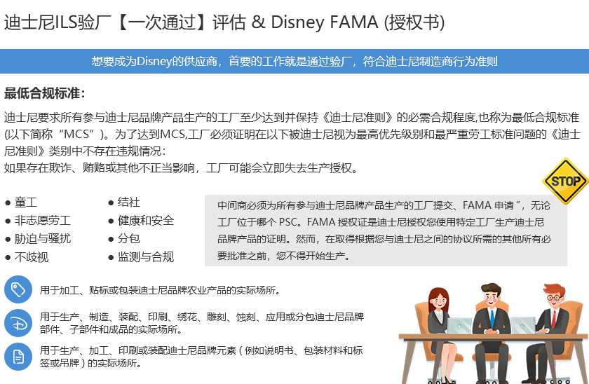 FAMA:AMA是Disney的認(rèn)證,中文叫“設(shè)備及經(jīng)營(yíng)認(rèn)證”,只有通過(guò)FAMA認(rèn)證之后,工廠(chǎng)才能得到Disney授權(quán)使用它的logo。客人會(huì)以表格形式給工廠(chǎng),主要是出于全球反恐的考慮,美國(guó)是不允許帶有任何恐怖嫌疑的國(guó)家和地區(qū)出口產(chǎn)品進(jìn)入美國(guó)。一般情況下,工廠(chǎng)填了表格之后,表示工廠(chǎng)遵守相關(guān)的法規(guī)和反恐需要,F(xiàn)AMA認(rèn)證在出口的時(shí)候需要提交給中國(guó)及國(guó)外海關(guān),以證明你的貨是經(jīng)過(guò)Disney授權(quán)的,不僅工廠(chǎng)安全,產(chǎn)品也是安全的。(通常情況下FAM自簽署日期起三年內(nèi)有效)